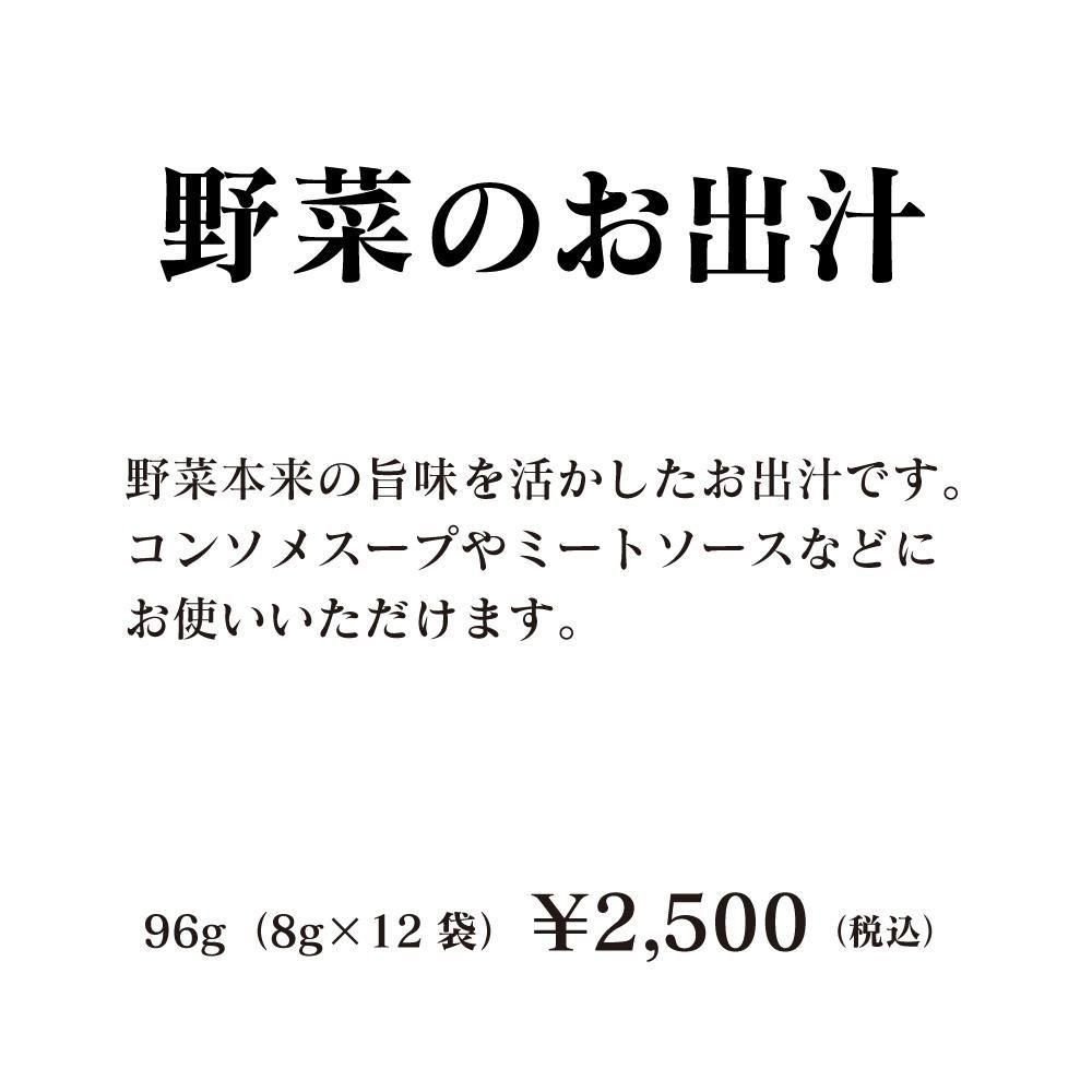 三幸食品のだしパック金沢 限定のお出汁 野菜のお出汁野菜本来の旨味を活かしたお出汁です。 コンソメスープやミートソースなどにお使いいただけます。96g(8g×12袋)野菜粉末(たまねぎ、にんじん、さつまいも、かぼちゃ)、食塩、でん粉分解物、酵母エキス特定原材料:なし