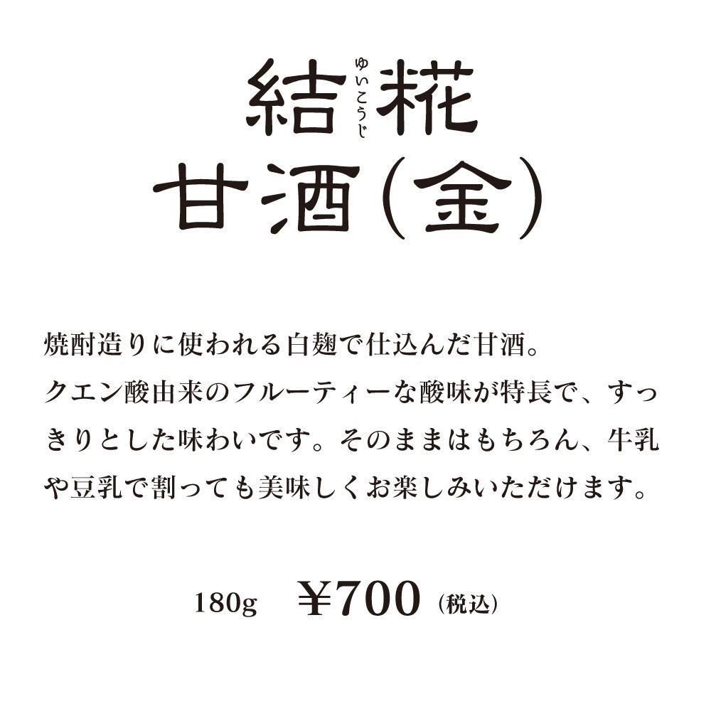 結糀 甘酒(金) 結糀 甘酒(金) 焼酎造りに使われる白麹で仕込んだ甘酒。